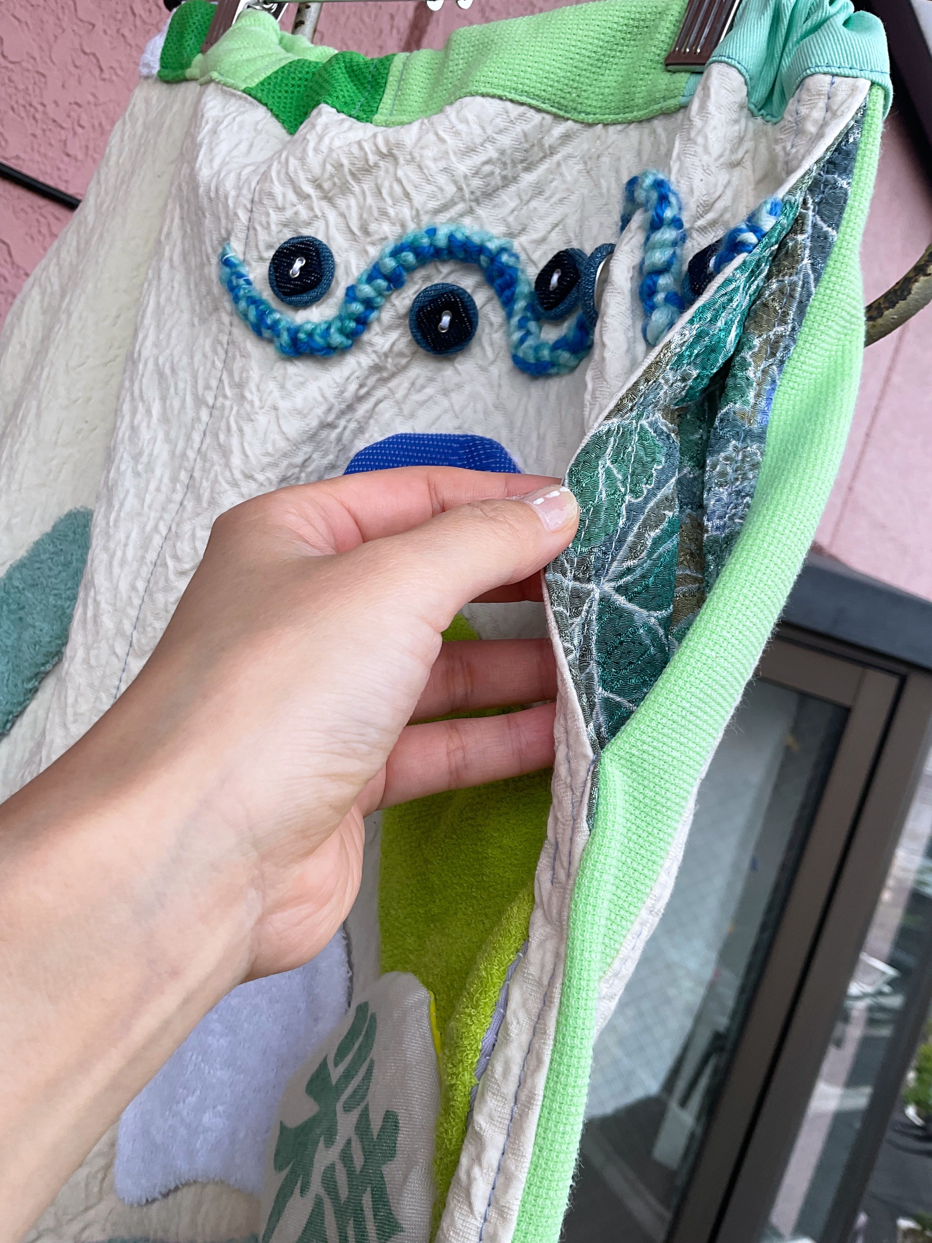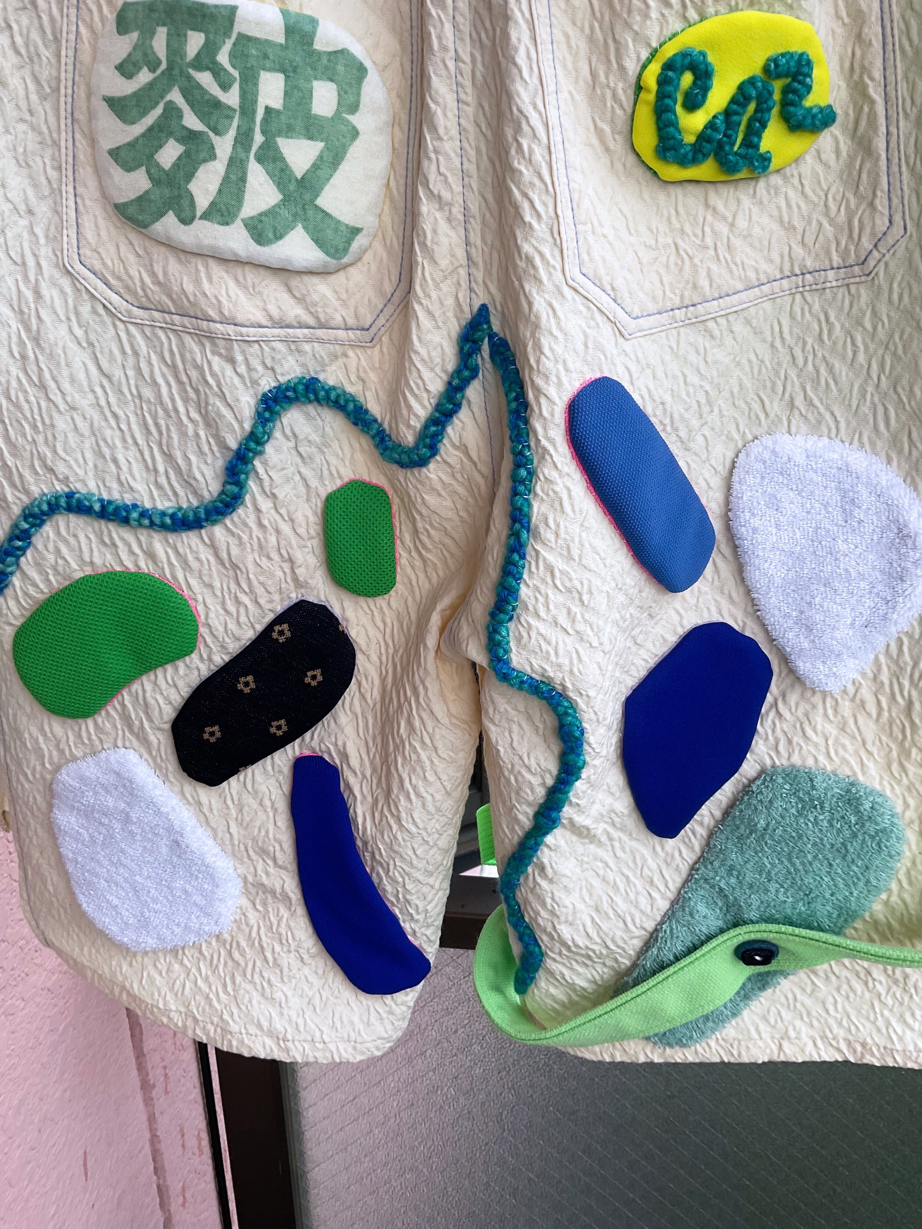 素材:綿生地、布袋、ポリエステルジャージ、タオル、紐、アクリルテープ、毛糸、ボタンなど。